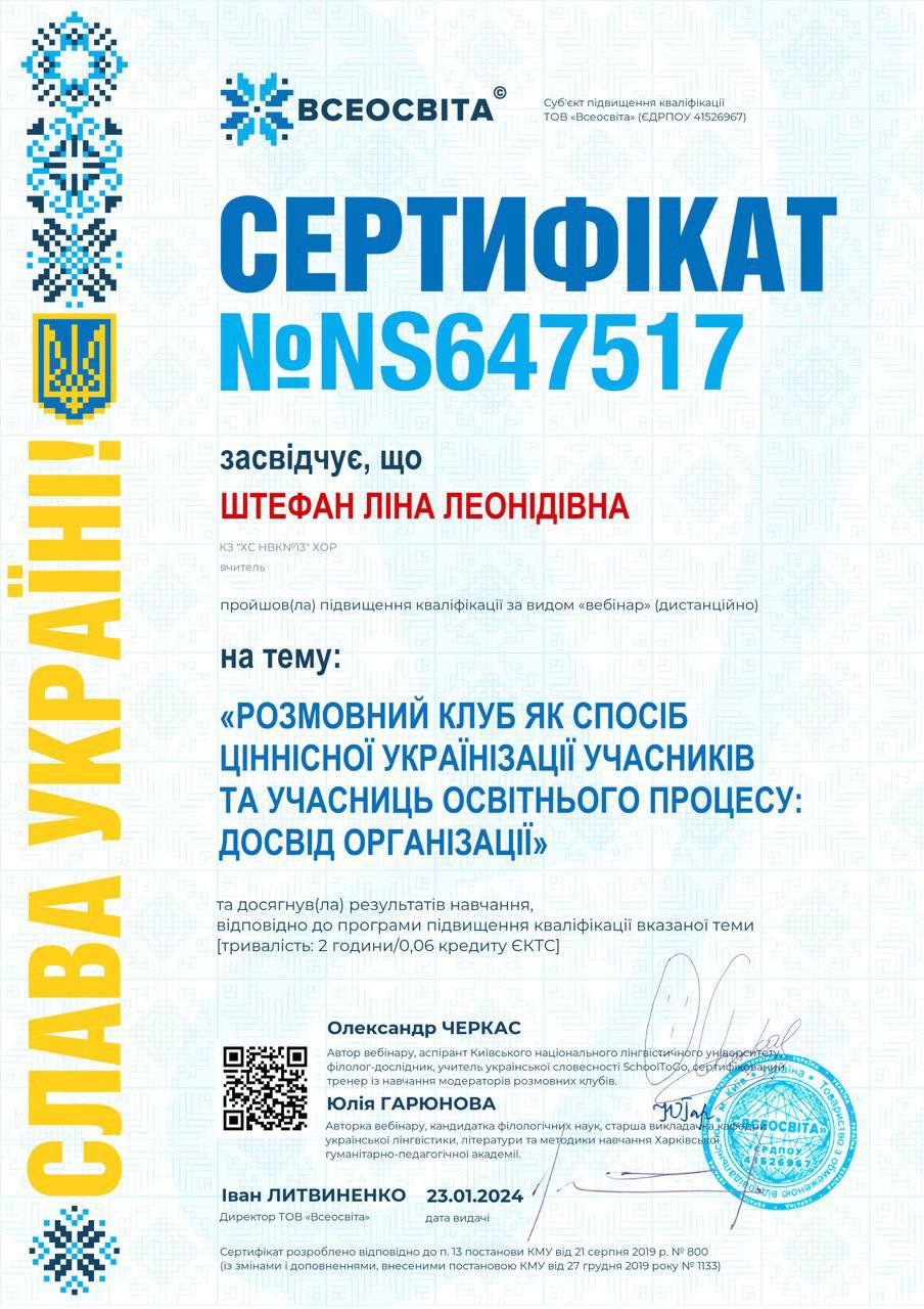 У січні 2024 року Ліна Штефан, вчителька української мови та літератури, підвищила кваліфікацію, відвідавши декілька онлайн-вебінарів/тренінгів від КІППО та «Всеосвіта» з таких тем: