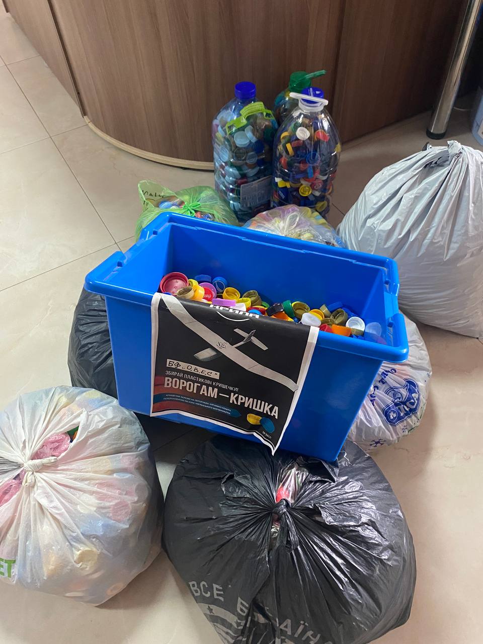 На канікулах ми здійснили чергову відправку кришечок на дрони в рамках ініціативи благодійного фонду «ОВЕС», який активно займається збором пластикових кришечок від харчових ємностей. Потім ці кришечки відправляються на переробку, а виручені кошти йдуть на закупівлю БПЛА для Збройних Сил України.