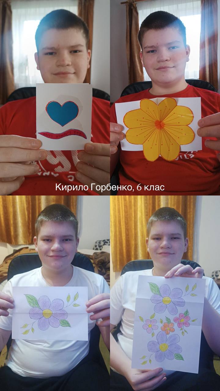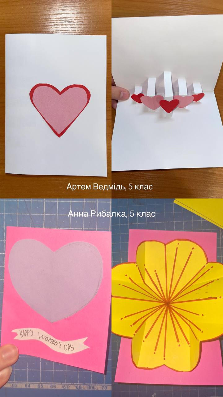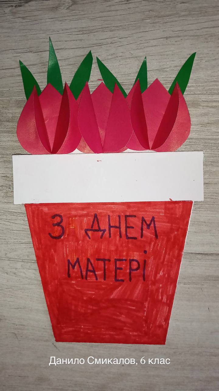 Учні 5 та 6 класів ,під керівництвом вчительки образотворчого мистецтва Дарʼї Даниленко ,привітали своїх матусь із Днем матері особливим чином — власноруч виготовленими листівками 🧑🎨🎨. Яскраві, зворушливі й натхненні листівки стали справжніми витворами мистецтва та щирими подарунками для найрідніших людей 🌸.