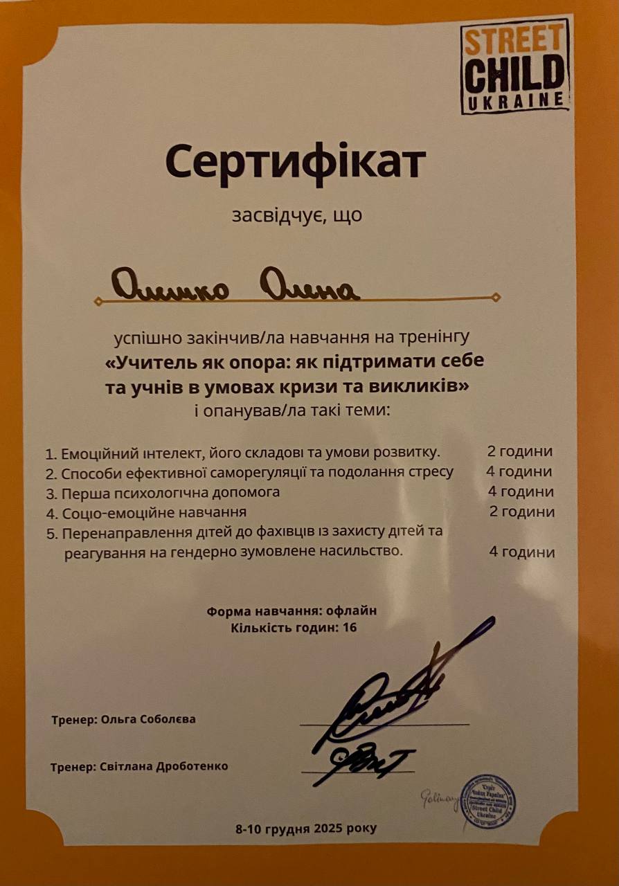 Вчителька музичного мистецтва Олена Олешко взяла участь у тренінгу «Учитель як опора: як підтримати себе та інших в умовах кризи та викликів», який відбувся у місті Жовква Львівської області.