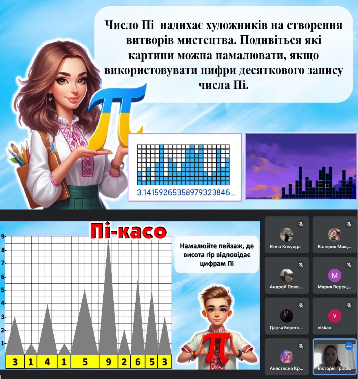 Крім цього, школярі розв’язували цікаві прикладні «пі-задачки», які допомогли їм краще зрозуміти практичне значення числа «Пі» у повсякденному житті. А ще вони змогли відчути себе справжніми митцями в ролі «ПІ-касо» — використовуючи послідовність цифр, учні створили унікальні художні роботи, зобразивши мальовничі пейзажі з горами.