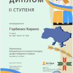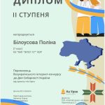 Наші учні 7 А та 7 Б класів Ксенія Кульшенко, Кирило Горбенко, Поліна Білоусова під керівництвом виховательки Олени Чепенко взяли участь у Всеукраїнському інтернет-конкурсі “День Соборності України”, який було проведено з 22 січня по 18 лютого освітнім проєктом На Урок.