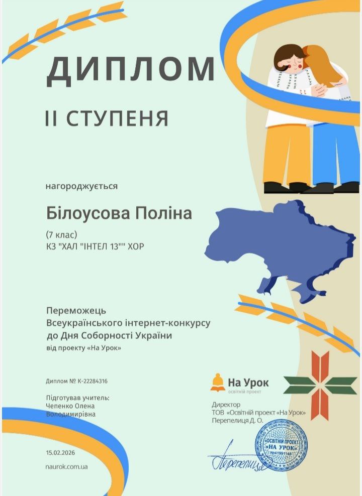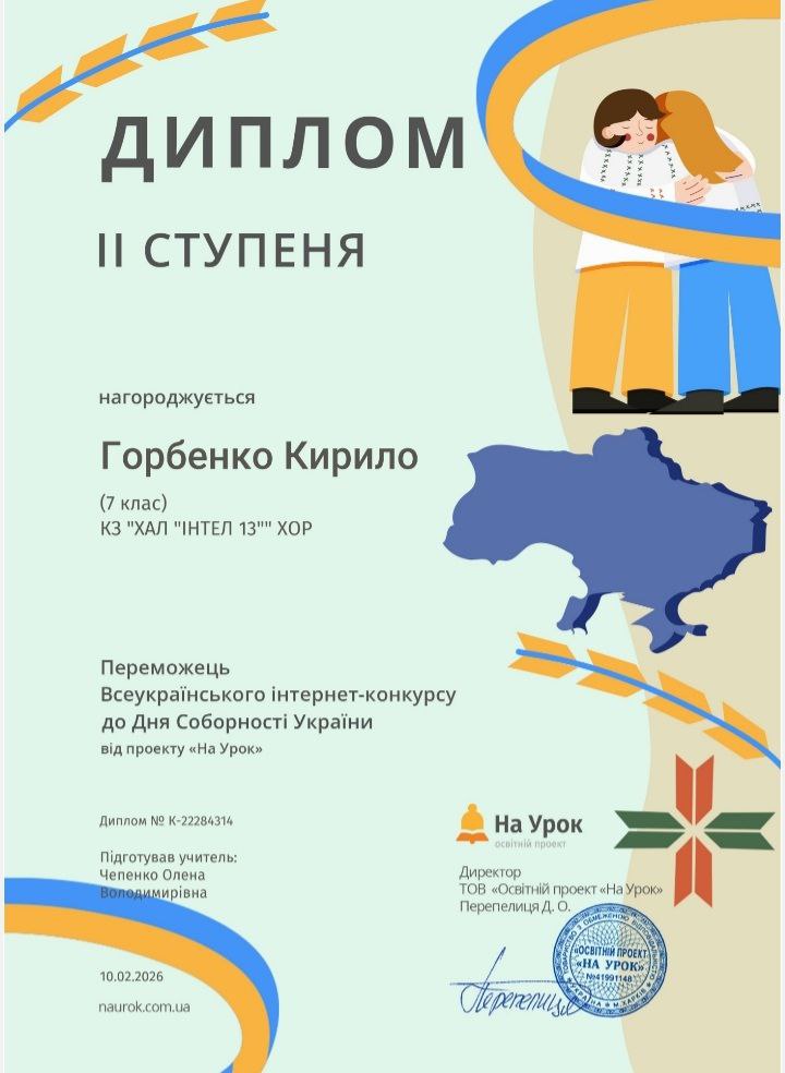 Наші учні 7 А та 7 Б класів Ксенія Кульшенко, Кирило Горбенко, Поліна Білоусова під керівництвом виховательки Олени Чепенко взяли участь у Всеукраїнському інтернет-конкурсі “День Соборності України”, який було проведено з 22 січня по 18 лютого освітнім проєктом На Урок.